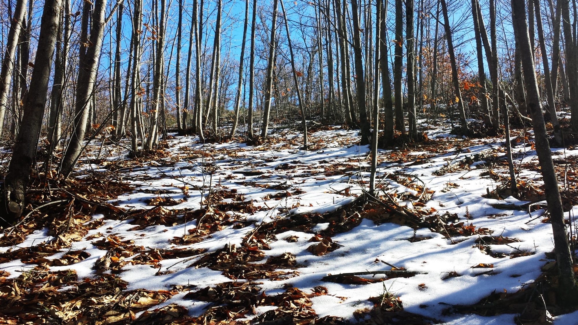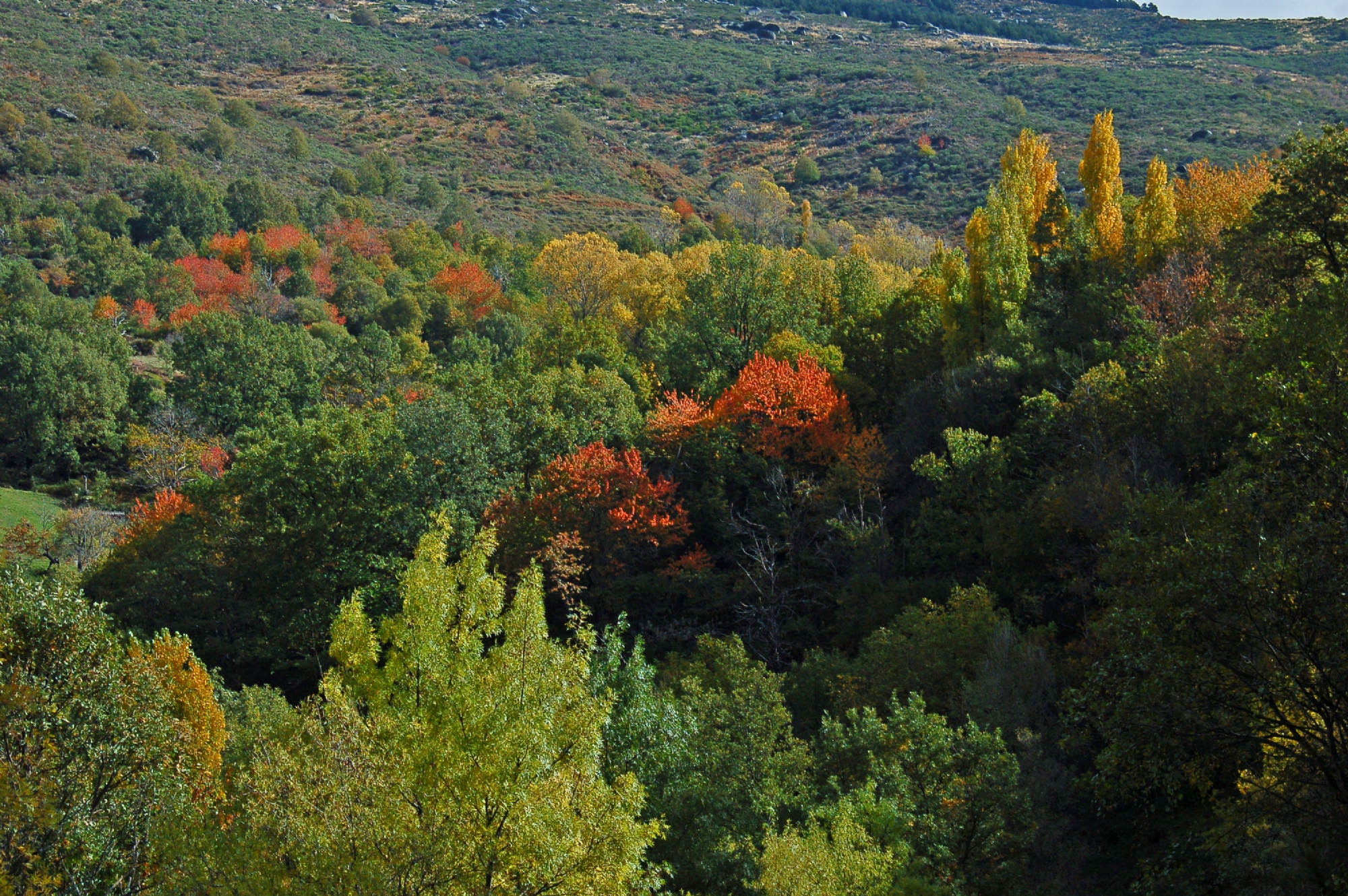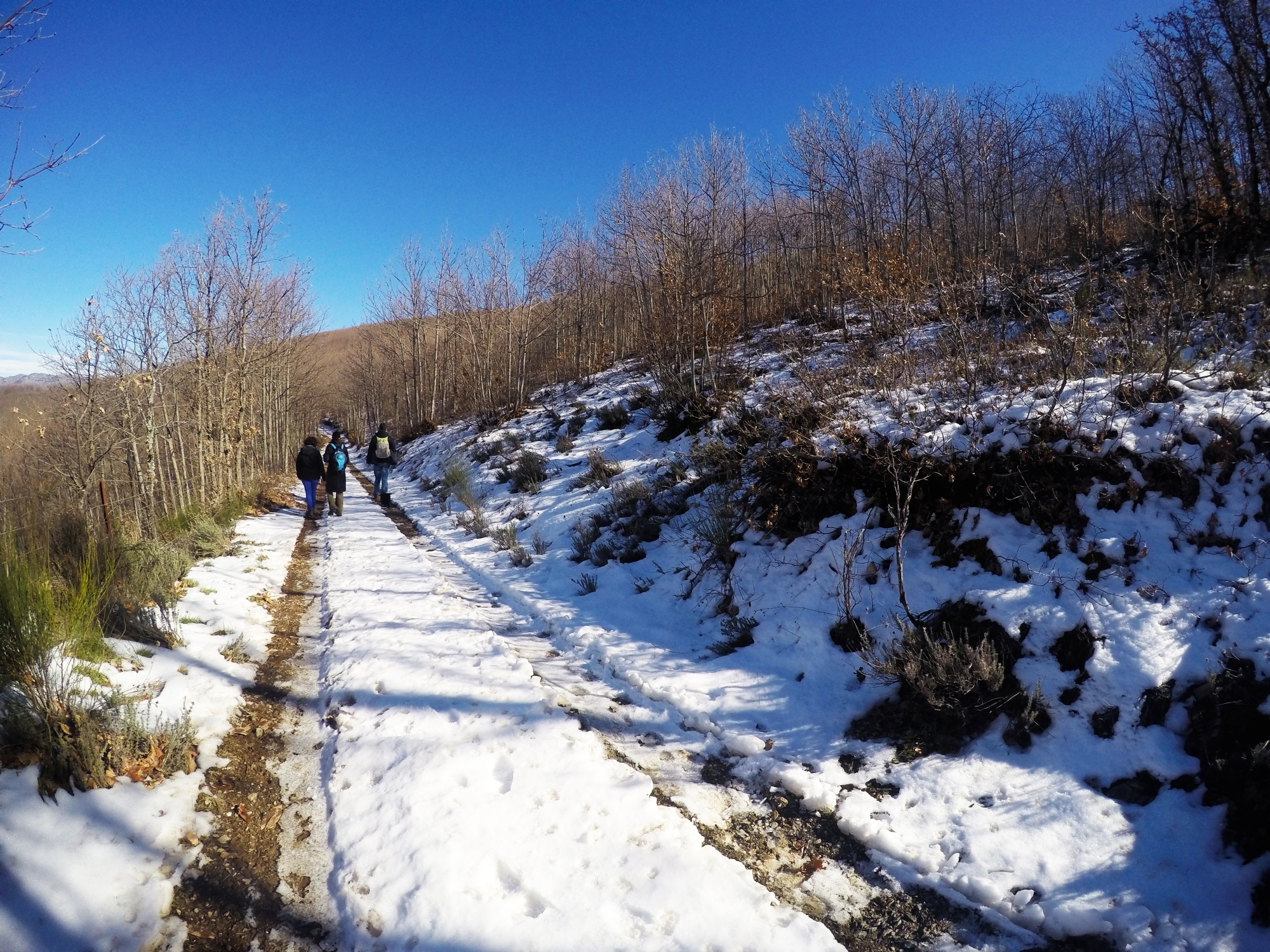La ruta se retoma por la calle que sale justo enfrente del Colegio Público, desde aquí subiremos por la pista de tierra que fue nuestro camino de bajada en la etapa anterior. Luego continuamos a la derecha entre densos robledales y castañares. Durante el ascenso el sendero proporciona espléndidas vistas del pico Jálama (1.492 m) y de gran parte de Sierra de Gata.