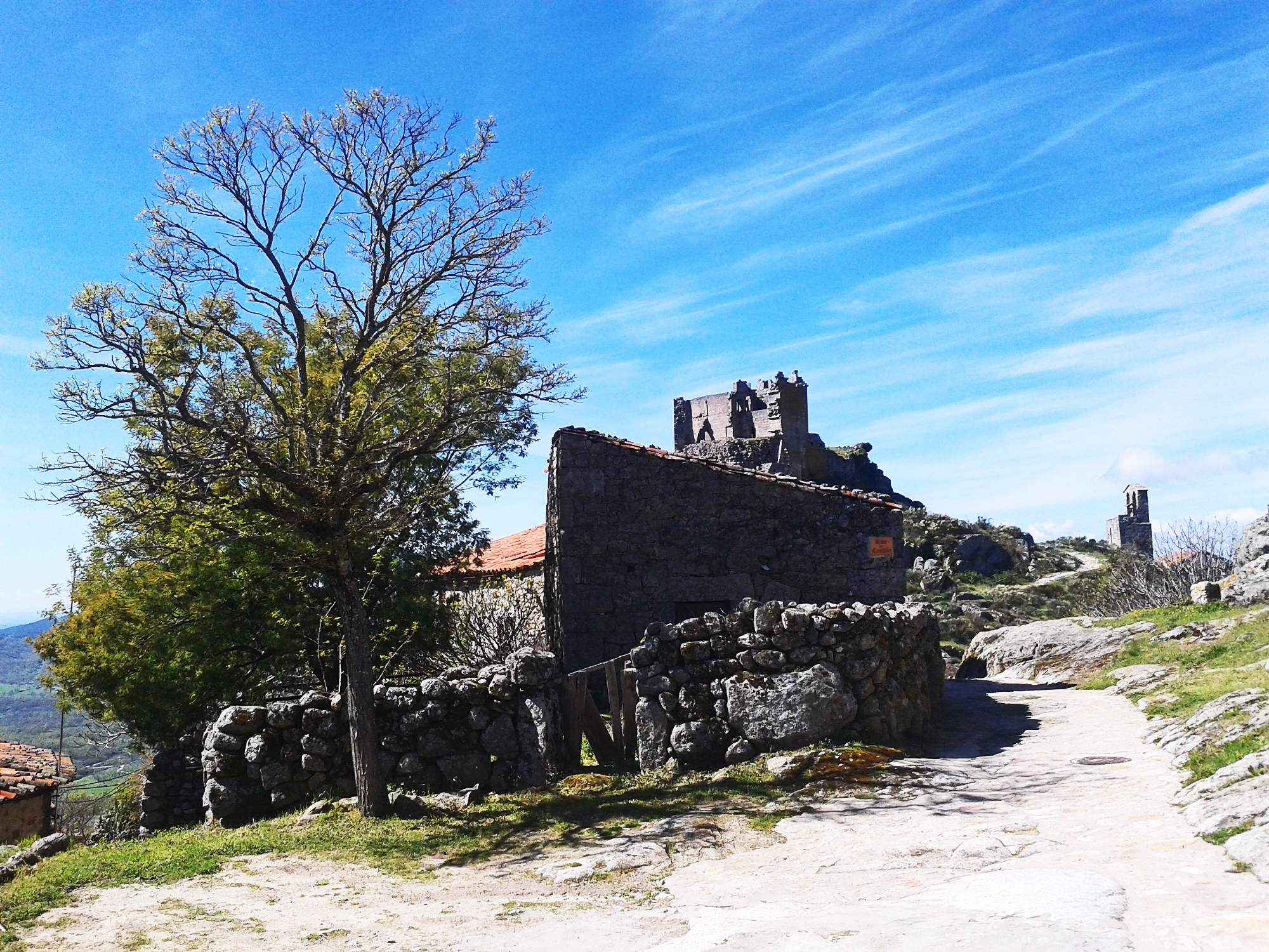Apenas unos cuantos vecinos resisten a la modernidad en esta pequeña aldea medieval. Nacida posiblemente a finales del siglo XII fue un imporante baluarte para la defensa debido a su situación estratégica. Mención especial merece su castillo, de origen árabe (s. XII), si bien lo que de él queda en pie (su torreón) es de época posterior, cuando las órdenes Militares, como las de Santiago y Alcántara, dominaban estas tierras. Te aconsejamos que subas hasta arriba del castillo y te detengas a contemplar las ruinas y el espectacular paisaje que le rodea. Las puestas de sol desde aquí son sencillamente sublimes. Por debajo del castillo se sitúa la pequeña Ermita de San Juan Bautista, con un altar exterior y rodeado de tumbas antropomórficas de pequeño tamaño excavadas en el omnipresente granito. También podremos observar, junto al recinto, una aislada espadaña orientada hacia el Oeste.